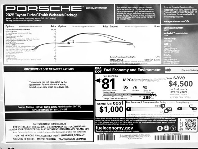 Dual Zone Front Automatic Air Conditioning, Bluetooth Wireless Phone Connectivity, Electric Power-Assist Speed-Sensing Steering, Back-Up Camera, Day-Night Auto-Dimming Rear view Mirror, Wing Spoiler, Valet Function, Tire Specific Low Tire Pressure Warning, Tailgate/Rear Door Lock Included w/ Power Door Locks, Smart Device Integration. This Porsche Taycan has a powerful Electric engine powering this Automatic transmission.*These Packages Will Make Your Porsche Taycan Turbo GT The Envy of Your Friends *Side Impact Beams, Rear Fog Lamps, Rear Child Safety Locks, Rain Detecting Variable Intermittent Wipers w/ Heated Jets, Power Rear Windows, Power Door Locks w/ Autolock Feature, Power 1st Row Windows w/ Front And Rear 1-Touch Up/Down, Perimeter/Approach Lights, Outside Temp Gauge, Manual Tilt/Telescoping Steering Column, LED Brakelights, Gas-Pressurized Shock Absorbers, Galvanized Steel/Aluminum Panels, Front Center Armrest, Fixed Rear Window w/ Defroster, Fade-To-Off Interior Lighting, Electro-Mechanical Limited Slip Differential, Dual Stage Driver and Passenger Seat-Mounted Side Airbags, Dual Stage Driver and Passenger Front Airbags, Driver And Passenger Visor Vanity Mirrors w/ Driver And Passenger Illumination.* Visit Us Today *Test drive this must-see, must-drive, must-own beauty today at Porsche Riverside, 8423 Indiana Ave, Riverside, CA 92504.